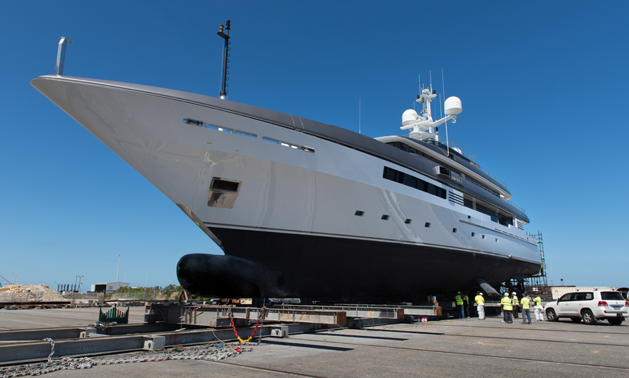 Refurbishment on the 51 metre superyacht ‘Aldabra’ is nearing completion. The exterior hull above the waterline and upper decks have all been painted to a classic, gleaming finish only the finest paints and workmanship can produce. To get this finish, artisan painters create a zone called a ‘habitat’ within the outer environmental protection screen. This ‘layer within a layer’ is then pressurised with filtered air, thus minimising foreign particles as much as possible.